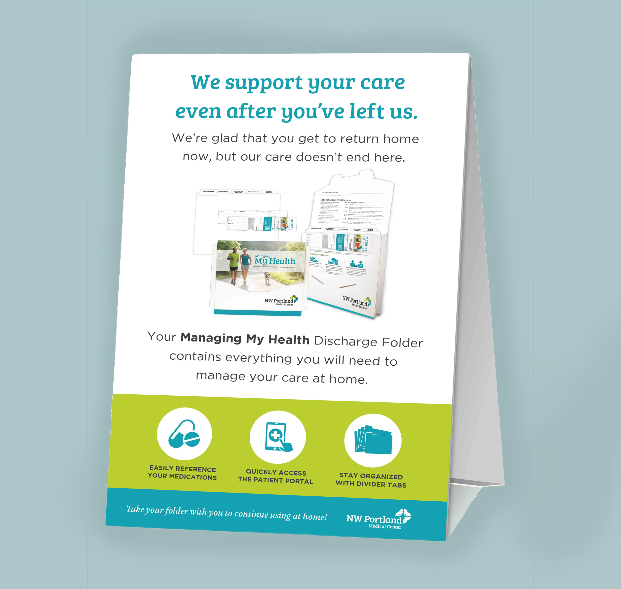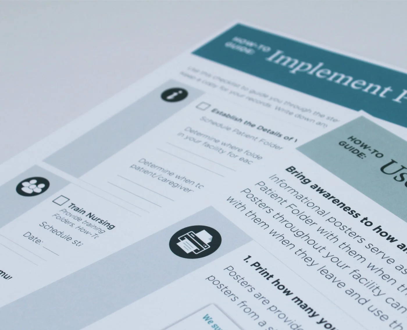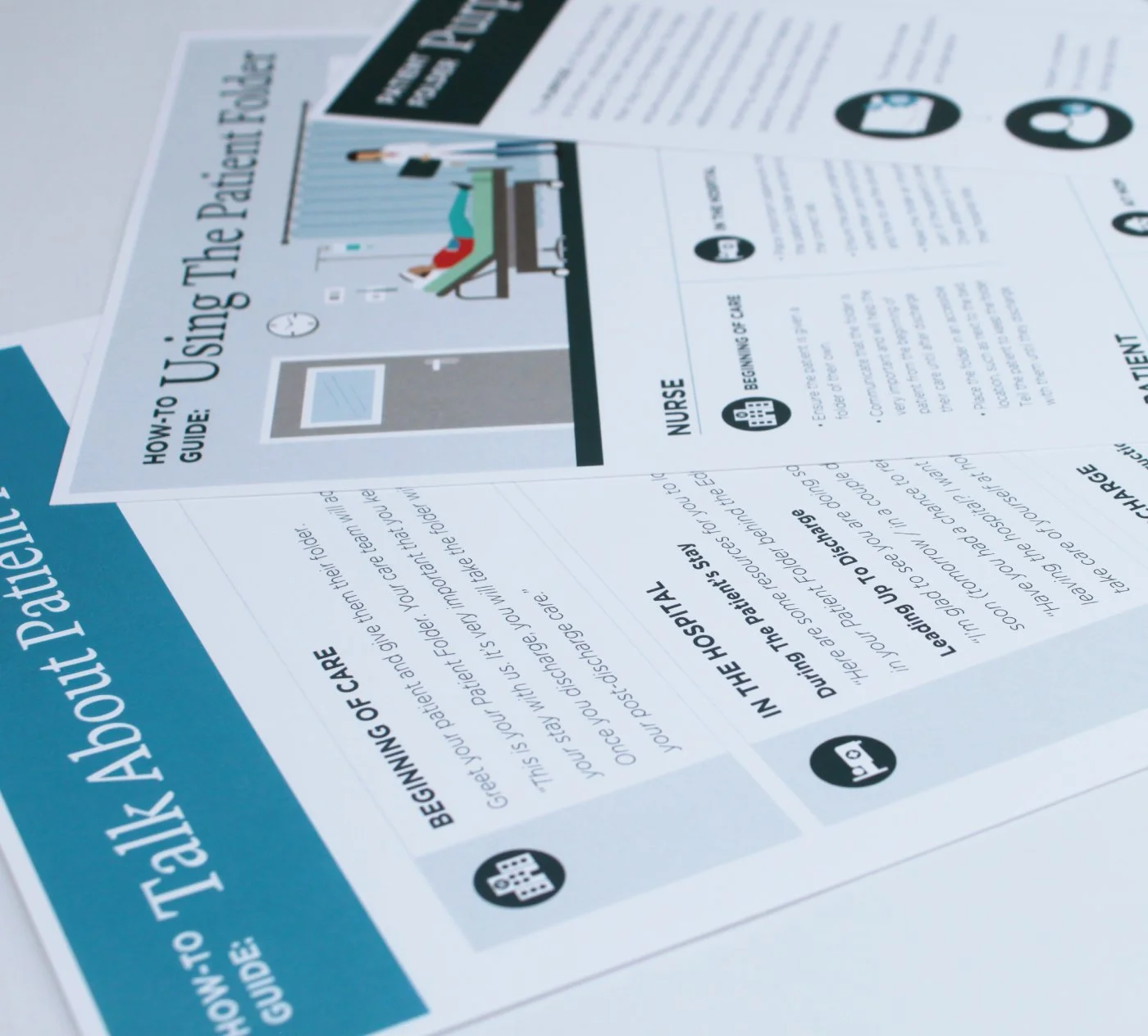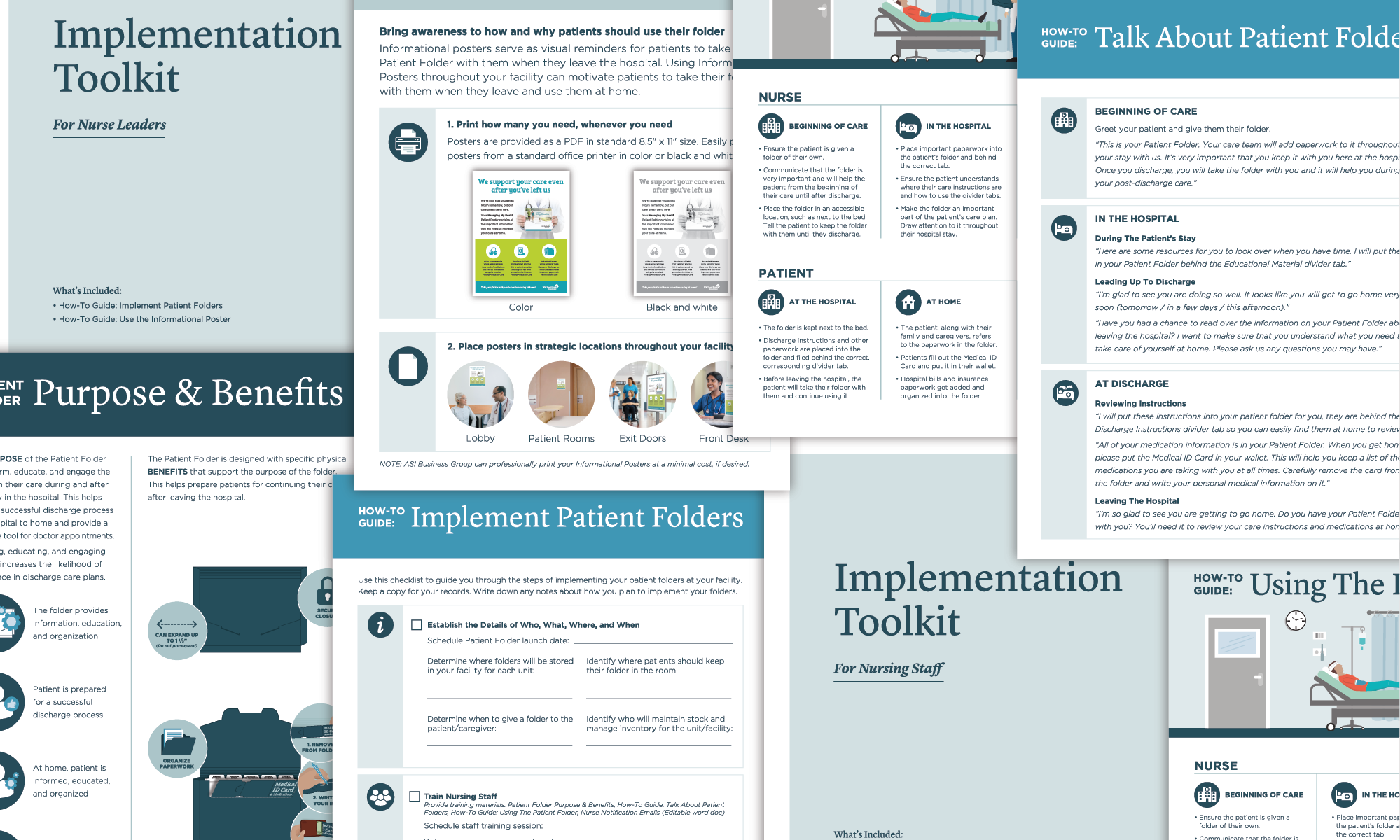 As healthcare organizations implemented their patient discharge folders, they needed structured guidance to help educate staff how to implement the new product and process successfully. I designed the Implementation Toolkit, a set of guides and supporting materials that guided healthcare organizations through onboarding, training, and early process adoption of their patient discharge folders. The toolkit translated complex operational information into clear visual documentation that could be used by multiple teams during implementation.